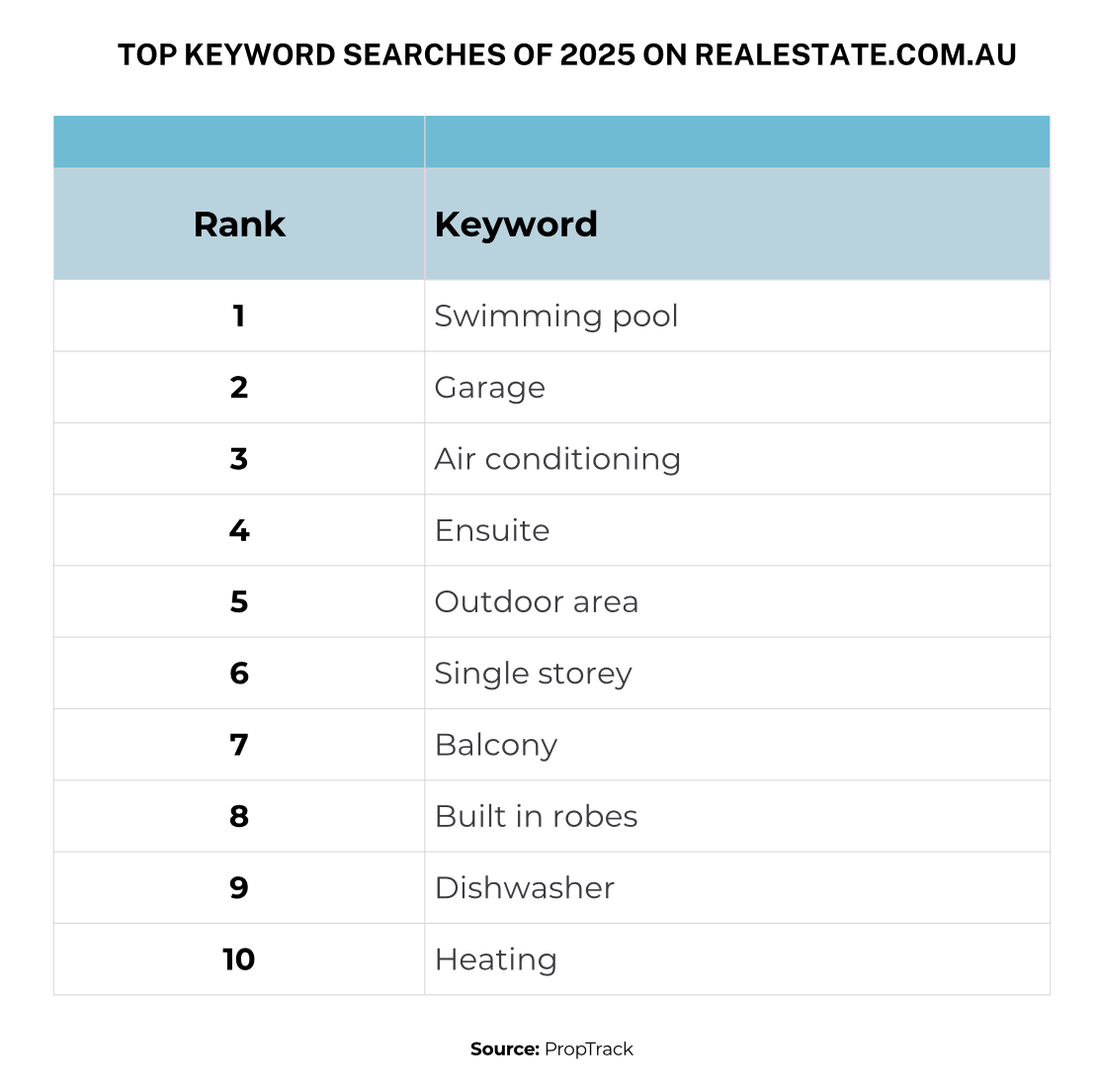 Search data from realestate.com.au (see below) reveals how buyer priorities have evolved, highlighting features people are actively filtering for as affordability shapes what’s realistic. These trends offer useful signals for anyone planning a purchase in 2026.